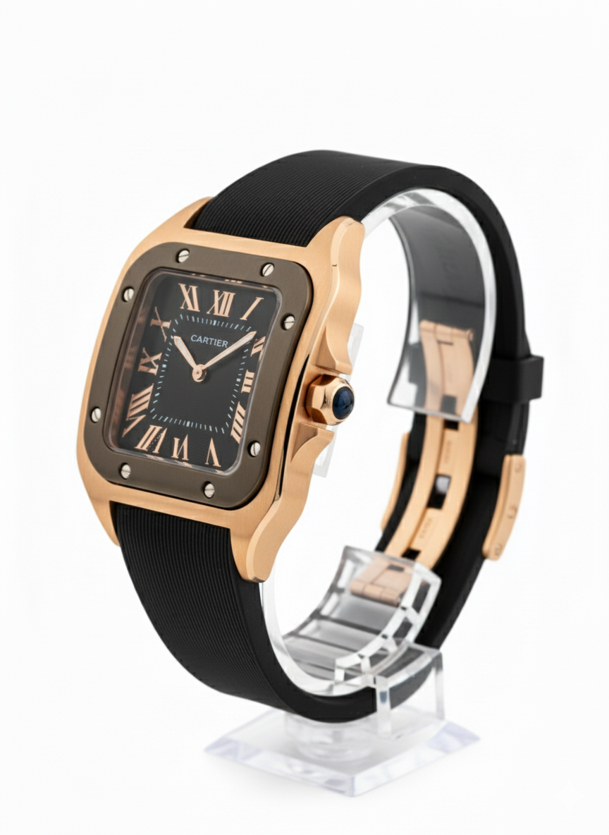 Water-resistant up to 100 meters, the Cartier Santos de Cartier in rose gold with a black dial and rubber strap is a versatile and bold statement piece, perfect for those who appreciate innovative design, luxurious materials, and a spirit of adventure.